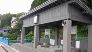 青森県風間浦村の鉄道アーチ橋メモリアルロードにある「下風呂温泉 足湯」です。大間鉄道の工事の跡地を観光用に再整備しており、駅を模した建物の中に足湯があります。高台にあり線路と港が見えました。浜湯系の源泉を引いており、灰色のお湯でした。