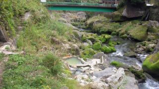 鹿児島県霧島市の国道沿いの野湯の「山の湯」です。緑色の橋が目印です。川への斜面を降りると浴槽が見えました。お湯は草色で、黒い藻が浮いており、激熱でした。2024年3月に対岸の廃墟が復活して「やまのゆ」ができ、日帰り入浴もできます。